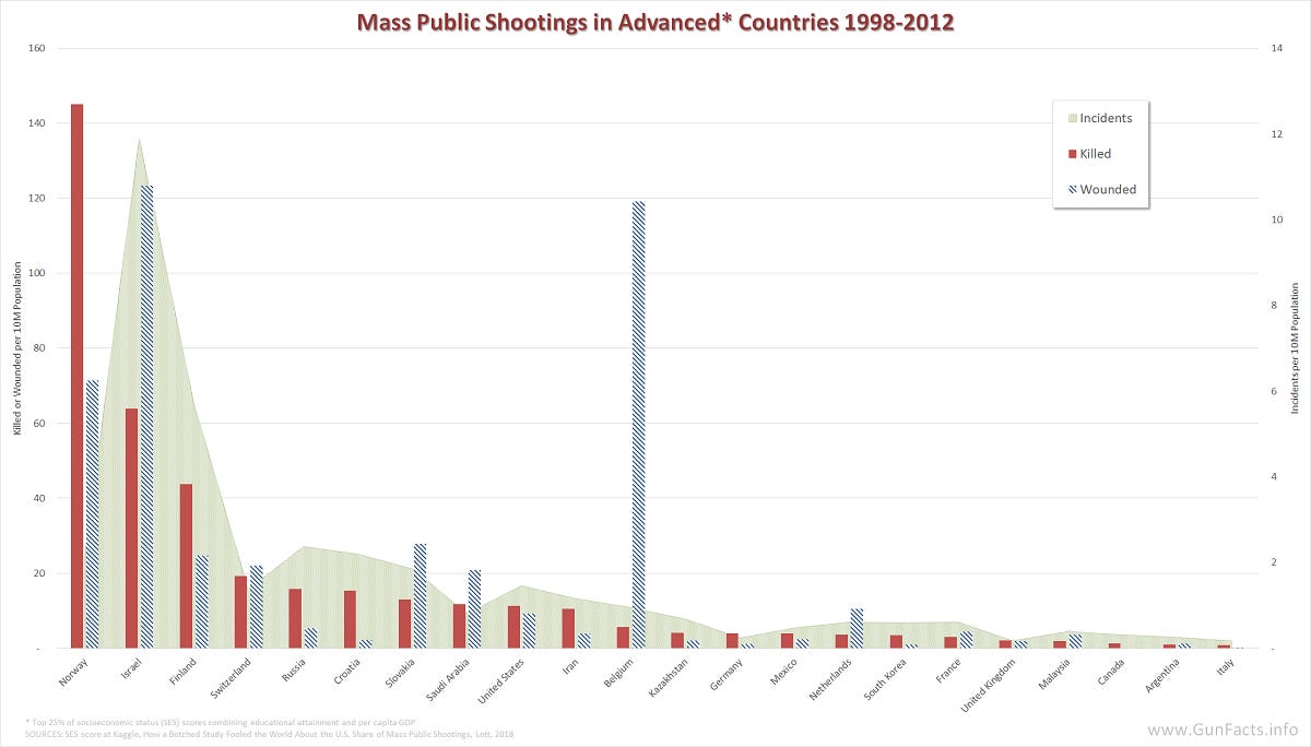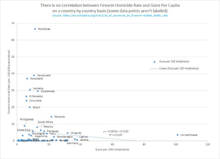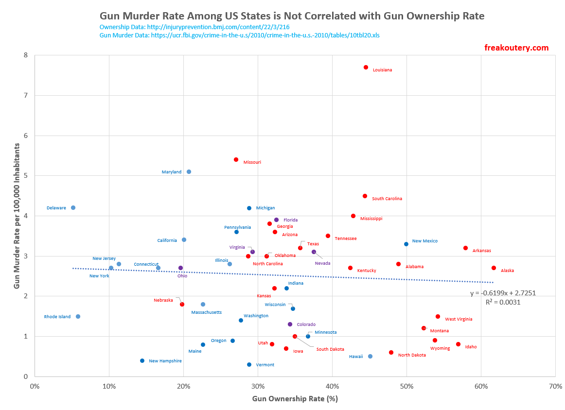 Here is an article illustrating the issue for US states. Here’s another covering regional and global breakdowns. Here’s another covering OECD standard developed countries and global stats. Here is a before-and-after analysis regarding various gun bans. Feel free to check the numbers as they are publicly available.